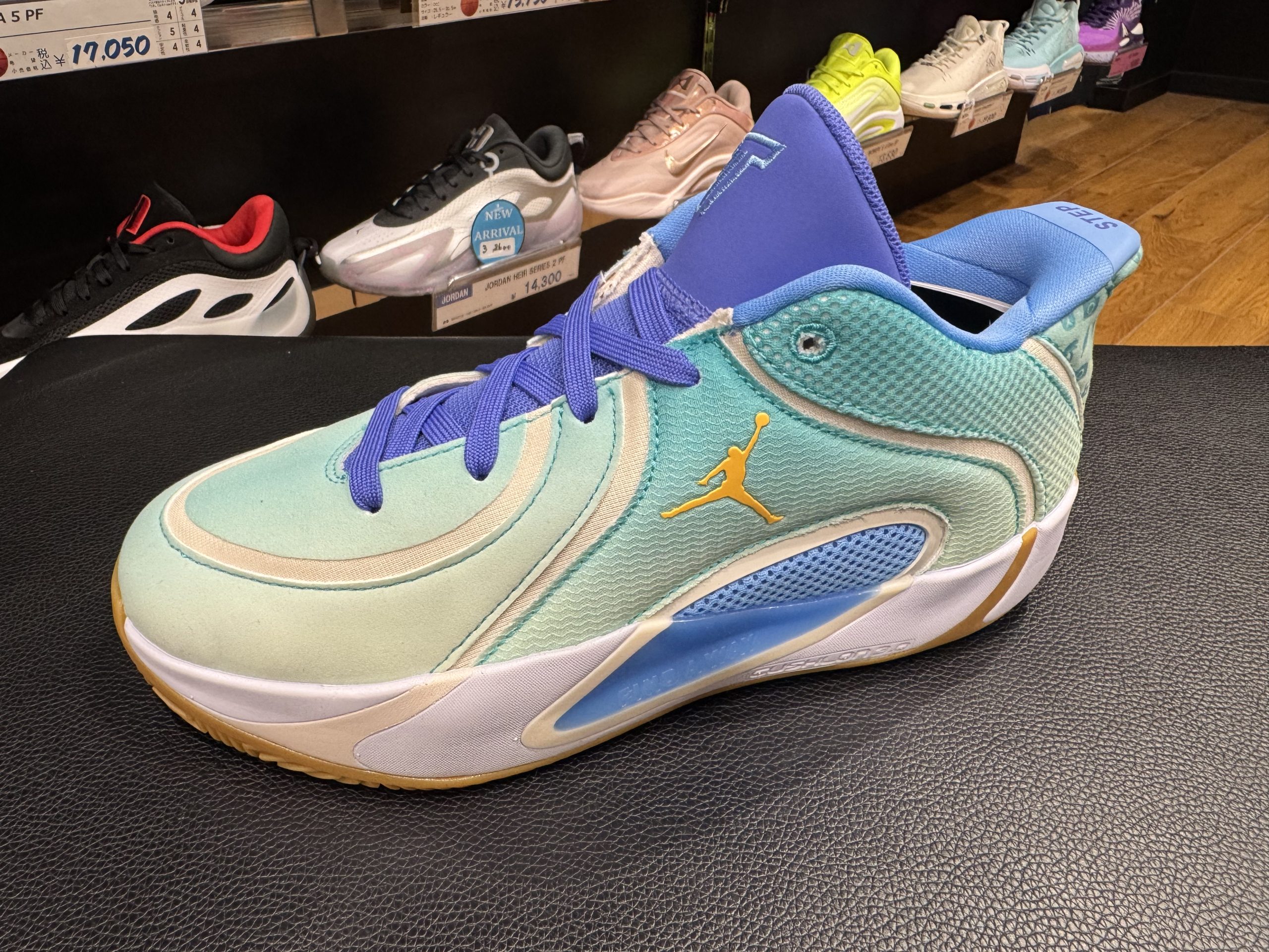 Wリーグの選手にも着用者がいるモデルです。何より軽いのが大きな特徴で、軽さはスピードに直結するので、ガードの選手などでも好んで履かれる方が多いです。シンプルで綺麗なカラーが多いのも人気の理由ですね。ヒールにはジェイソン・テイタム選手の背番号0のデザインが入っていて、そこも可愛い。ジョーダンの小さいサイズ展開はモデルが限られていますが、テイタムシリーズは別格で人気があります。